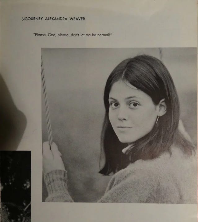 Me encanta lo que Sigourney Weaver escribió en su anuario y me voy a hacer un cartel con ello para ponerlo sobre mi ordenador. Lo leeré en las horas bajas.